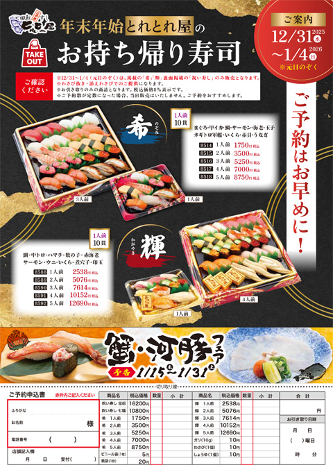 年末年始のテイクアウト・祝い寿し 2024年12月31日(火)〜 2025年1月3日(木)