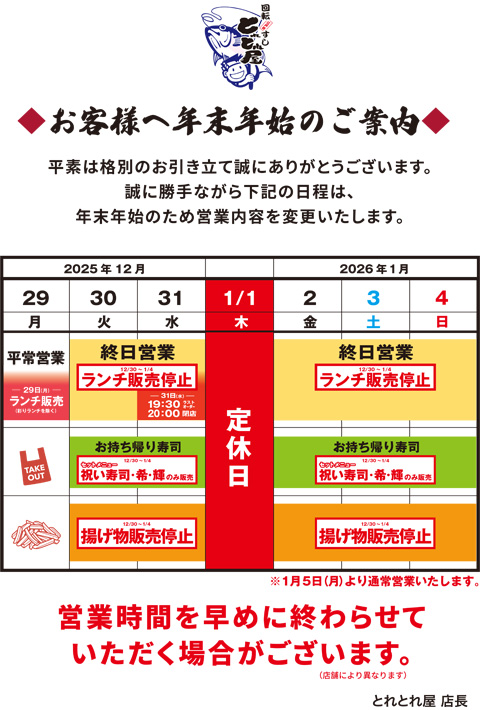 年末年始のテイクアウト・祝い寿し 2024年12月31日(火)〜 2025年1月3日(木)